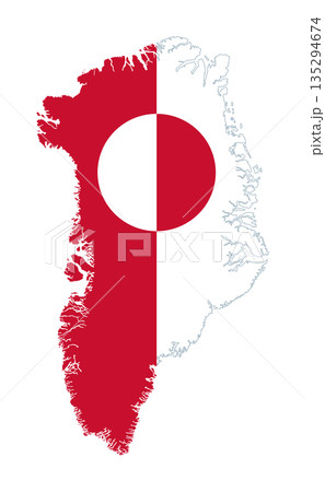Greenland flag in country silhouette. Vertical displayed national flag of Greenland, a bicolor of white and red with counterchanged disk, set in the outlines of the largest island of the world. Vector