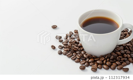 Coffee cup filled with dark brew sits atop a bed of roasted coffee beans, showcasing rich textures and inviting aroma, perfect for beverage and culinary themes