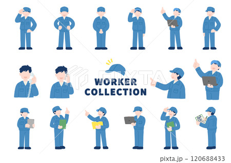 いろいろなポーズをした作業服を着た男性のフラットなイラスト(セット)