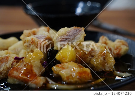 Tangsuyuk is a Korean-Chinese dish consisting of fried pork served with a sweet and sour sauce.