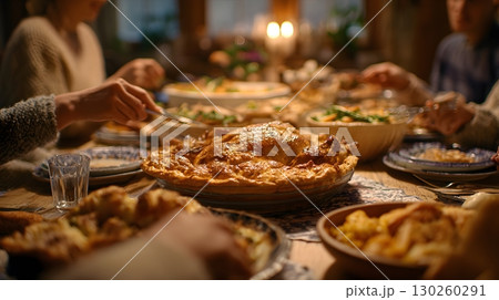 family gathering around autumn feast table with roasted turkey vegetables pie warm cozy home light high detail 8K
