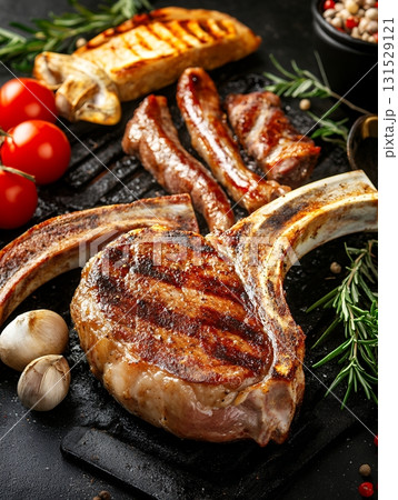 Grilled Tomahawk Steak Ribs Rosemary Garlic Delicious Food Photography bbq meat beef pork herb cook