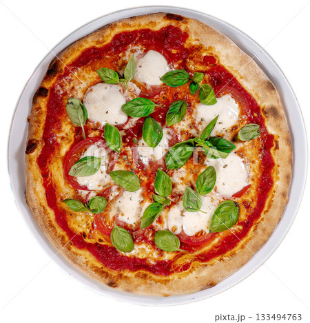 Caprese pizza tomatoes, mozzarella and basil on light wooden table