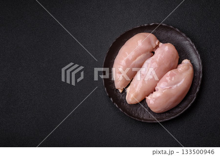 Fresh raw chicken breast fillet, organic meat. Black background. Top view