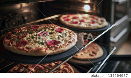Close-up of multiple pepperoni pizzas baking on trays in a home oven. Captures the warm glow, melting cheese, and golden crust. Perfect for home cooking, comfort food, or family meal concepts