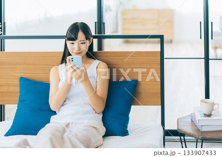 ベッドでスマホを見る若い女性