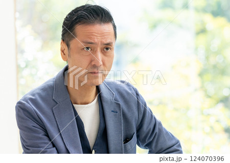 若いハンサムな男性の美容やビューティーの透明感、爽やかスキンケアイメージ 顎に手を当てて考える