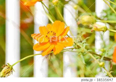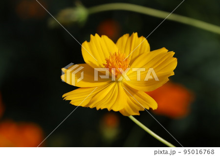 秋の庭に咲くオレンジ色のキバナコスモスの花