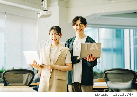 ノートパソコンを持つ若いITエンジニアの男女