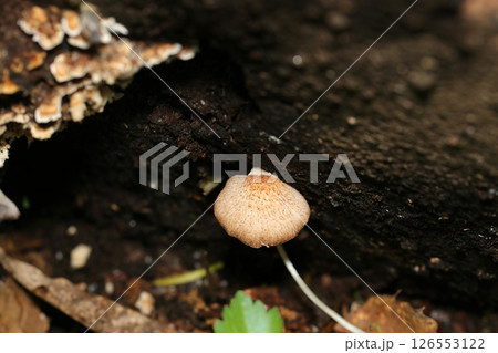 伐採林の朽木の間から顔を出すクリゲノチャビラタケたち(自然環境下菌・キノコ類ストロボマクロ撮影)