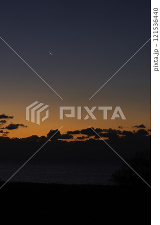伊豆下田のマジックアワーに浮かぶの三日月と爪木崎灯台の絶景
