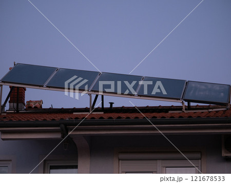 Solar panels installed above the tiled roof. Ventilation pipe with rotating nozzle. Solar energy concept. Pula, Croatia - January 3, 2025