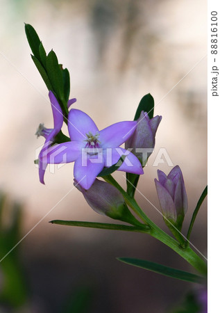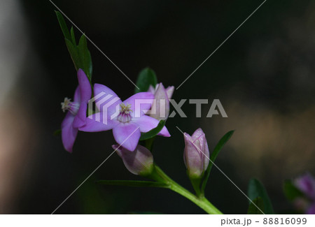 Close up of the star shaped pink flowers of the Australian native Crowea saligna, family Rutaceae, in Sydney forest, NSW. Autumn to winter flowering.
