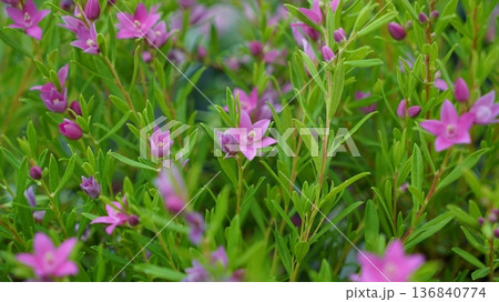 Vibrant pink star shaped flowers of the Australian native waxflower Crowea exalata, family Rutaceae. Evergreen shrub endemic to Victoria, flowers summer, autumn and winter.