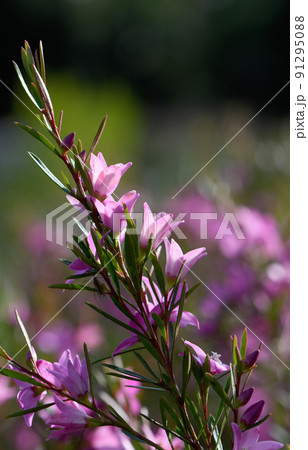 Backlit pink star shaped flowers and buds of the Australian native waxflower Crowea exalata, family Rutaceae. Evergreen shrub endemic to Victoria, flowers summer, autumn and winter.