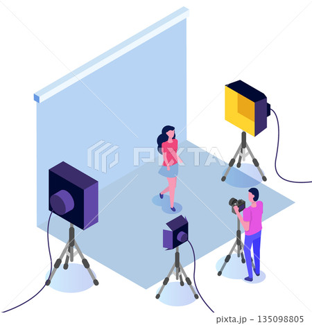 Photo session isometric, studio with spotlights and man with camera. Vector Illustration.