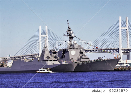 横浜港に停泊中のイージス護衛艦DDG-177「あたご」と、FFM-1「もがみ」