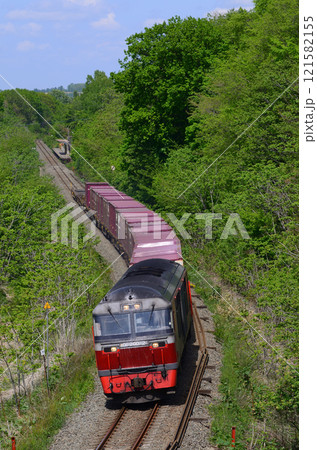 色とりどりのコンテナを牽き春の暖かな陽射しを浴びて走る貨物列車