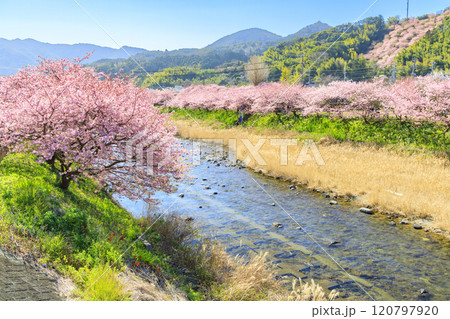 満開の桜:ソメイヨシノ:アップ:天の川の土手:桜並木