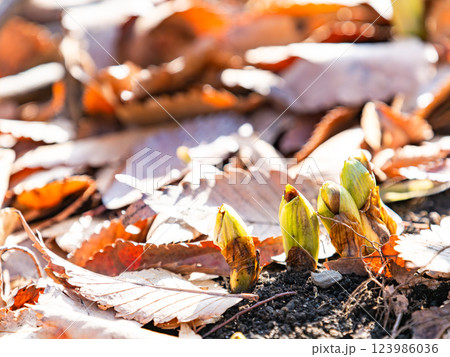 新春の嬉しい景色 落ち葉の中から顔を出したフクジュソウ