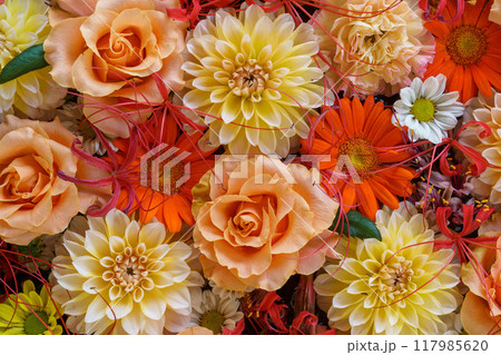 たくさんのオレンジ色のダリアの花