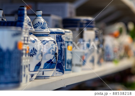 Amsterdam, Netherlands, April 2022. Close up of souvenirs of delft blue pottery.
