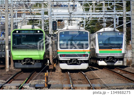 並んだE235系0番台とE231系1000番台とE233系3000番台