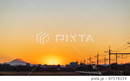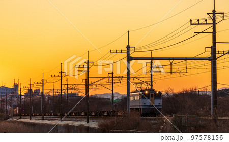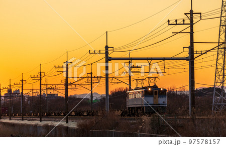 「埼玉県」夕日を浴びて見沼田んぼを疾走するコンテナ貨物列車「EF652127」 武蔵野線