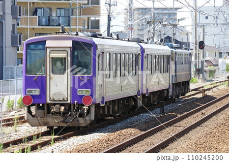EF65型電気機関車に牽引されて山陽本線・西明石駅付近を回送されるJR西日本キハ120形気動車