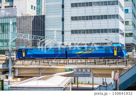 日本の横浜都市景観 桜木町駅を通過するJR貨物EH200形電気機関車ECO-POWERブルーサンダー