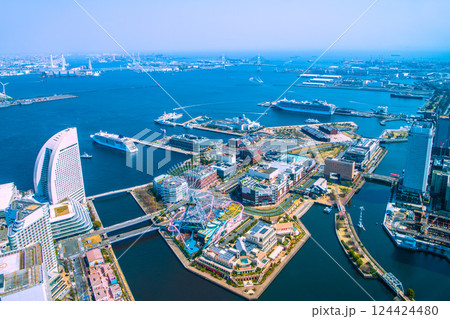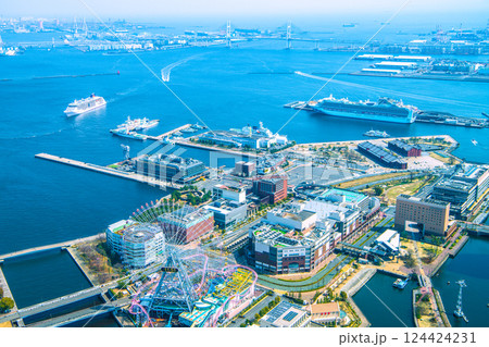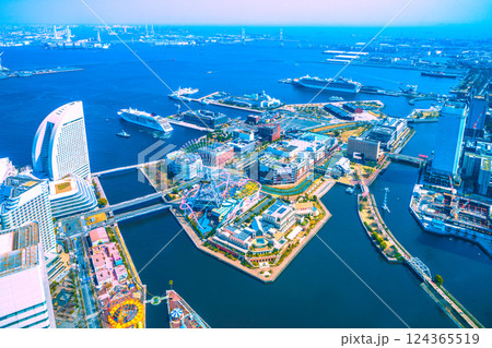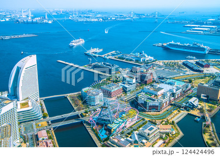 日本の横浜都市景観 大さん橋のダイヤモンド・プリンセスなどを望む。(この日は、オイローパ2が初入港)