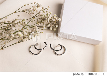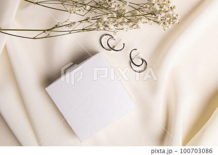 Close up of diamond earrings and gift box mock up copy space - handmade jewellery