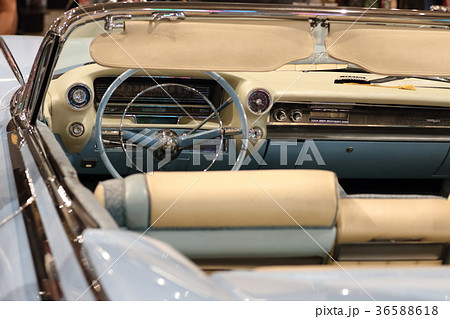 Close view of American flag on antenna of white convertible with chrome and light leather interior, soft flower bokeh in daylight