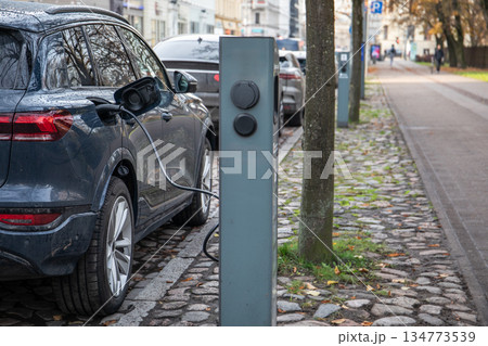 Electric Car Charging at Public Station on Urban Street
