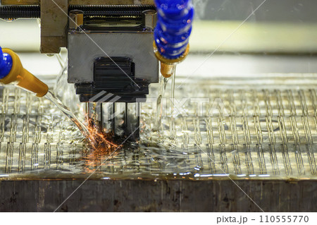 Closeup scene the wire EDM machine cutting the mold insert parts.