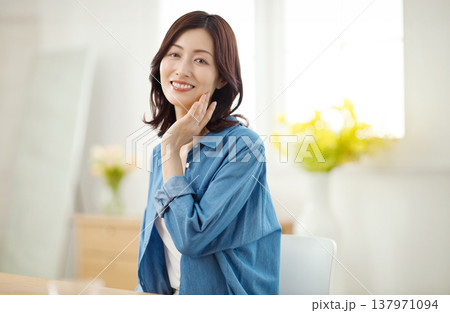 自宅で鏡を見てスキンケアをする若い日本人女性のポートレート