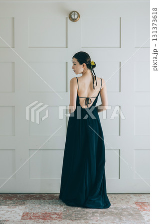黒いドレスでポージングする女性モデルのスタジオポートレート
