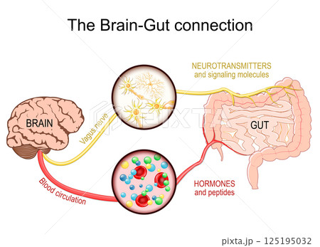 Gut brain connection. Interaction, cooperation and health effects from emotions and thoughts to stomach digestive system. Enteric nervous system in human body. Signals from brain to digestive tract