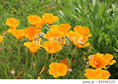 春の公園に咲くカリフォルニアポピー(ハナビシソウ)のオレンジ色の花