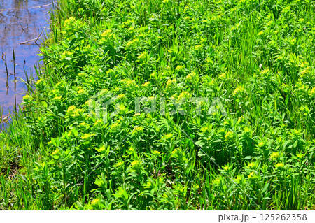 散歩コースの水辺に群生するノウルシ 上尾丸山公園付近