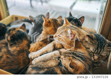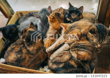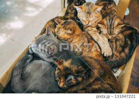 段ボールの中にいるたくさんの猫 雑種