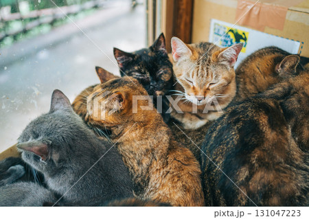 香箱座りで昼寝をする三毛猫【神奈川県・城ヶ島】