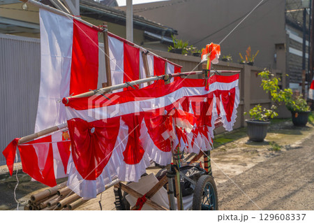 インドネシア独立記念日を祝う赤白の旗を売る屋台(移動販売)