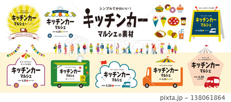 キッチンカー、フードトラック、マルシェのフレーム、タイトルと人々、イラストの素材セット/春夏カラー