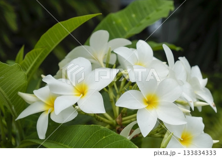 The white frangipani with leaves. White plumeria.Plumeria flowers - White plumeria on the plumeria tree.