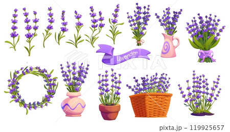 Lavender flowers in flowerpots, wreath and bouquets, vector Provence or French design. Cartoon lavender flowers in pink pots and wicker basket with ribbon banner for wedding or garden herb cosmetics