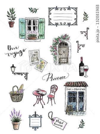プロヴァンスのカフェ&旅モチーフ 透過背景の手描き水彩イラストセット