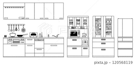 シンプルな手描き風キッチンベクターイラスト ラフ かわいい 手書き 台所 食器棚 料理 調理 冷蔵庫