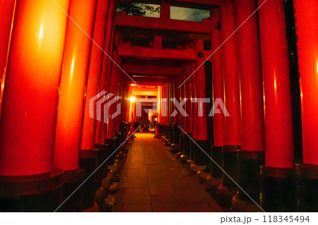 京都伏見稲荷大社夜の千本鳥居参道に交差する光と影