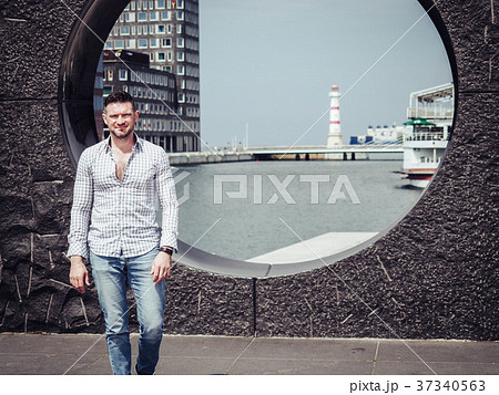 Handsome guy strolls along the sea embankment against the background of the lighthouse